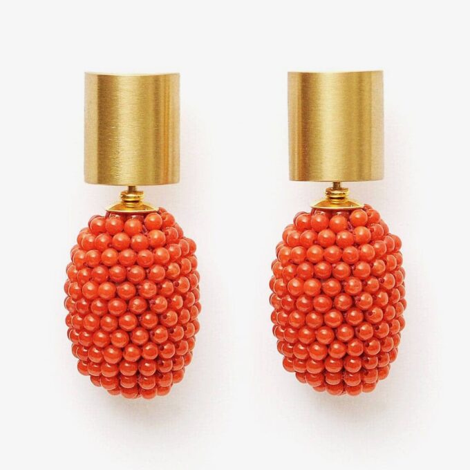 Paar Ohrringe; Stecker: Rechtecke aus Gelbgold; Einhänger: Korallen-Kaviar Oliven und Gelbgold